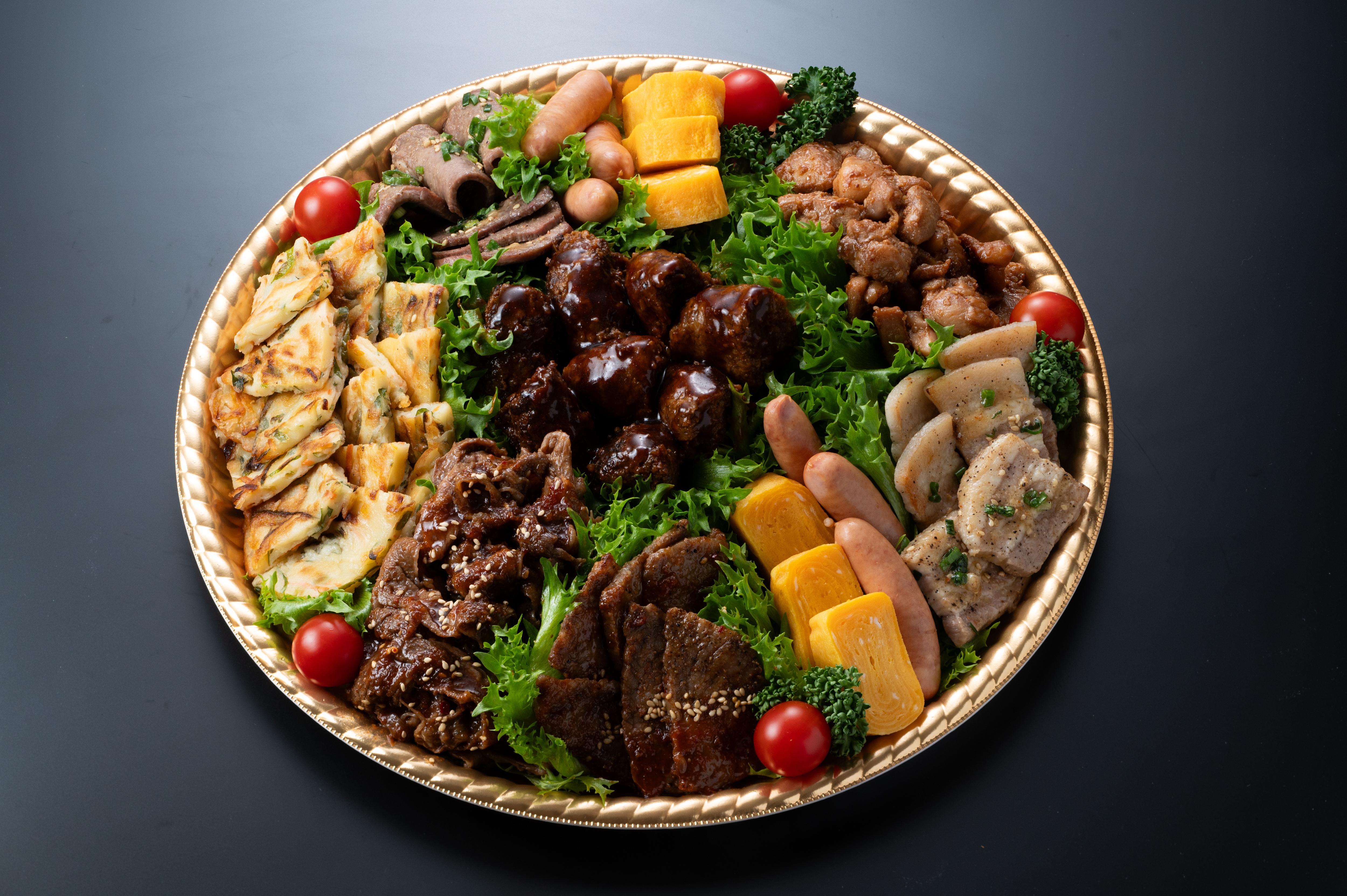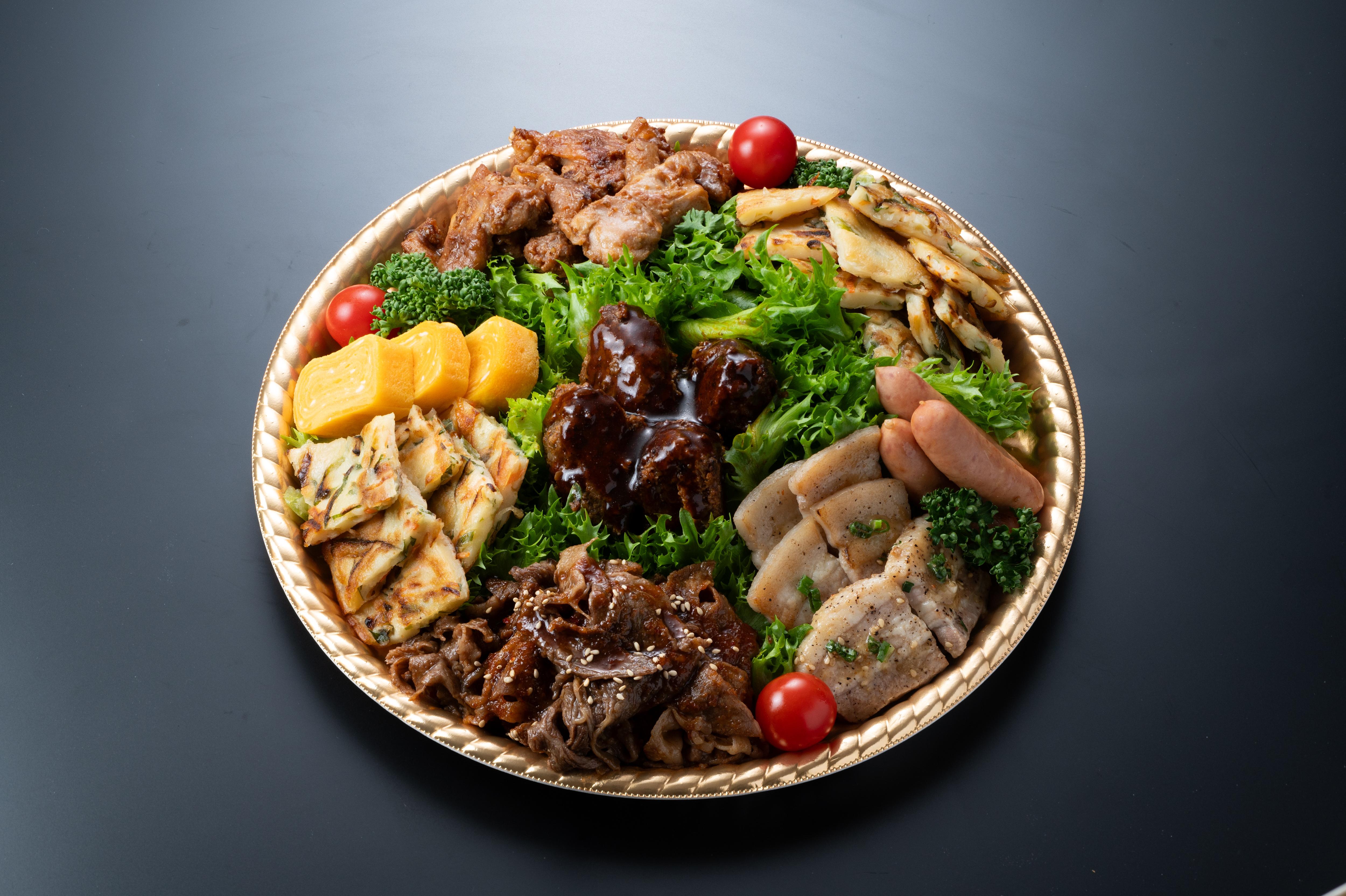 特製焼肉・ハンバーグオリジナルソース・ 粗挽きウインナー・豚バラ塩焼き・鶏モモ・タレ焼き・チヂミ・玉子焼き